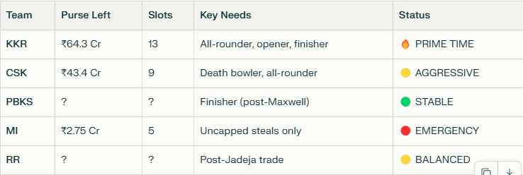 🔴 LIVE PURSE TRACKER (As of 8:56 PM IST)KKR: ₹64.3cr → ? (Heavy bidding expected)